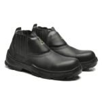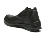 Botina de segurança, com elástico lateral recoberta, dorso acolchoado, confeccionada em fibras de poliester com acabamento em poliuretano, forração interna da gáspea em não tecido e forro do cano em tecido com alto poder de absorção, biqueira em composite, palmilha de não tecido e sobrepalmilha de eva, solado isolante elétrico de poliuretano (pu) bidensidade, constituído por duas camadas, injetado diretamente ao cabedal.