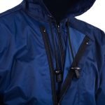 A vestimenta possui capuz fixo e fechamento frontal duplo, através de dois zíperes de nylon e lapela, ou zíper e velcro. Modelo fornecido com faixas refletivas de 50 mm contornando o tórax. As faixas refletivas utilizadas atendem a NBR 15292 (Vestimentas de Segurança de Alta Visibilidade).