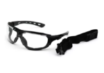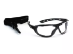 DE POLICARBONATO, COM TRATAMENTO ANTIRRISCO, ANTIEMBAÇANTE E UV. POSSUEM APOIO NASAL EM BORRACHA TERMOPLÁSTICA, HASTES TIPO ESPÁTULAS CONFECCIONADAS EM POLICARBONATO E BORRACHA TERMOPLÁSTICA CO-INJETADAS NAS CORES PRETO E CINZA, PODENDO SER REMOVIDAS PARA COLOCAÇÃO DE ELÁSTICO AJUSTÁVEL.